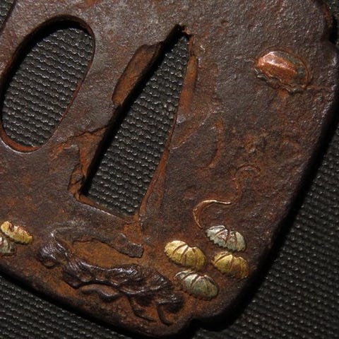 Japansk tsuba i smedet jern fra Edo-perioden af Daito Kiri Zogan Tsuba, C5-421, med guldbelægning, måler 8,4 x 8,4 cm og 0,5 cm tyk, vægt 160–230 g med æske, i Fair-stand og over 200 år gammel. Klik på den blå "gå til varen" knap, for at købe eller byde på denne vare. Den samlede pris vil blive vist inden du afgiver dit bud.