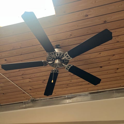 Loftventilator med 5 sorte vinger. Ventilatoren er monteret i loftet og har metalhus med dekorative detaljer.