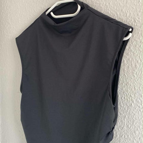 Lindex top til kvinder i str. S. Toppen er sort og fremstillet i polyester og elastan. Modellen har dyb V-udskæring foran og bagpå samt indsnøring/rynkeeffekt i taljen, der giver en let peplum-lignende pasform. Velegnet som overdel til både hverdag og mere formelle anledninger, fx sammen med bukser, nederdel eller shorts. Ny og stadig med tags på.