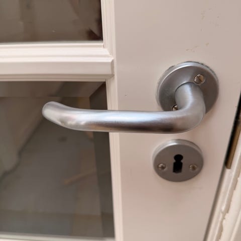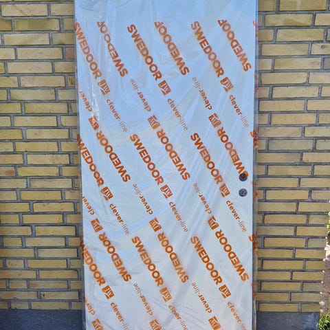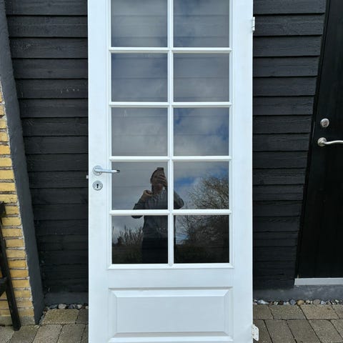 Swedoor. Døren måler 72,5 x 200 cm og er udført i hvid melamin. Modellen har tre glaspartier og er forberedt til enkeltlåsesystem. Velegnet som yderdør, hvor der ønskes lysindfald gennem ruderne.