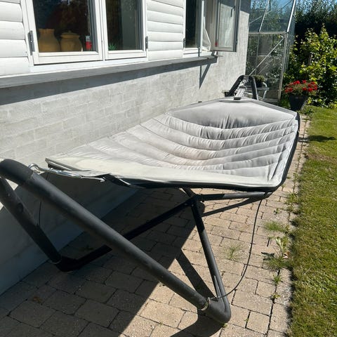 Har kun været brugt udenfor i godt vejr. Hængekøjen er monteret på et fritstående stativ med metalstel. Stoffet er polstret for øget komfort og har ophæng i begge ender, så den ligger stabilt i stativet. Velegnet til afslapning både inde og ude, afhængigt af materialets vejrbestandighed.