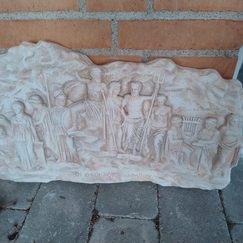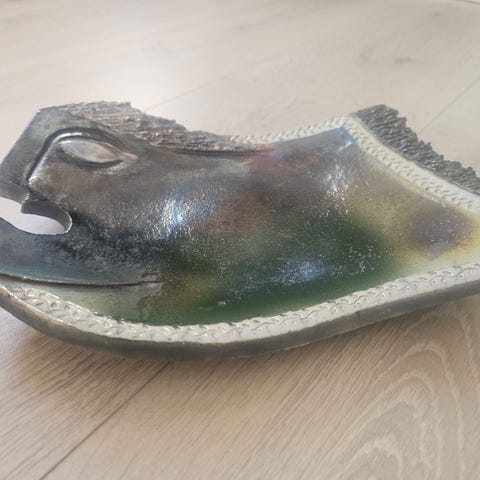 Vægrelief med egyptisk motiv udført i farvet ler/keramik Motivet viser tre figurer i egyptisk stil med detaljerede smykker, hår og klædedragter samt planteornamentik. Relieffet er rektangulært 47x60 med ophængsbeslag på bagsiden til vægmontering. Forsiden er farvelagt i dæmpede nuancer af blandt andet beige, blå, brun og grøn. Egnet som dekorativ vægudsmykning i hjemmet eller som tematisk indslag i et rum med historisk eller etnografisk indretning.
