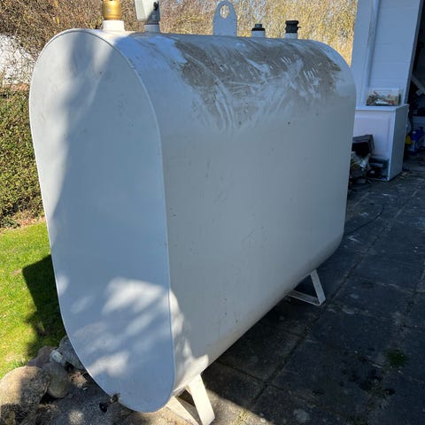 Udendørs olietank til 1200 L olie fra 1981 (har attest) i hvidmalet metal med ovale ender og monterede ben til placering på fast underlag. Tanken er forsynet med tilslutninger og måler på toppen til kontrol af indhold. Egnet til opbevaring af olie eller fyringsolie ved bygningens ydermur, hvor der er behov for stationær lagertank. Tanken er tom.