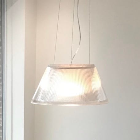 Flos Romeo Louis loftlampe designet af Philippe Starck. Romeo Moon S2 Pendlen har en ydre skærm i klart rillet glas og en indre skærm, der giver et diffust og behageligt lys. Lampen hænger i flere wirer fra loftet og egner sig til placering over spisebord eller i opholdsrum, hvor der ønskes et direkte nedadrettet lys kombineret med blød rumbelysning. Mål dia 50 cm højde 22cm