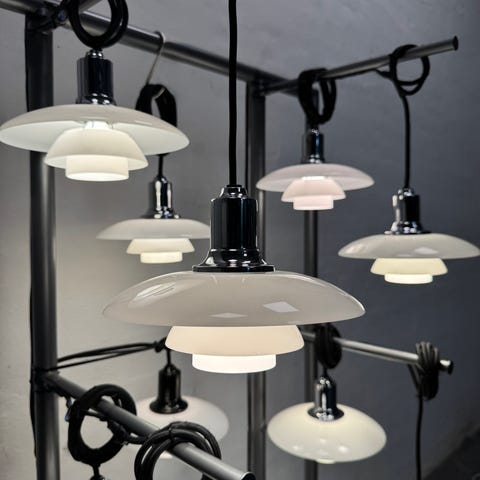Lampen er designet af Poul Henningsen og produceret hos Louis Poulsen.