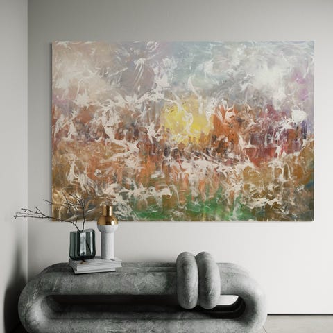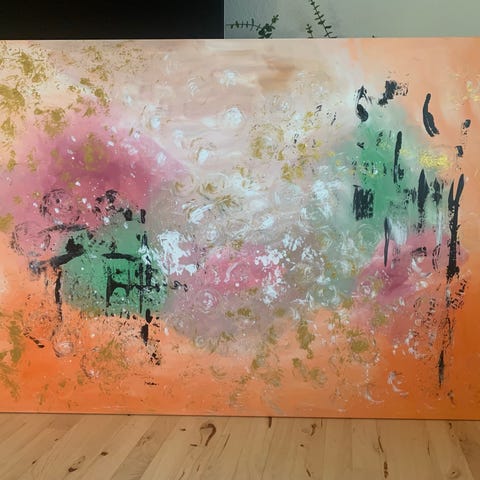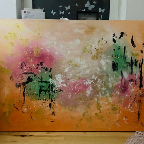Abstrakt maleri på lærred i flere farver, herunder grønne, blå, gyldne, hvide og rosa nuancer. Maleriet har et organisk, flydende motiv med strukturerede penselstrøg og farvefelter, der løber på kryds af lærredet. Egnet som vægdekoration i stue, kontor eller andre opholdsrum, hvor der ønskes et farverigt og moderne udtryk.