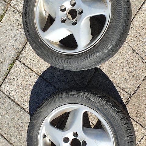 Der sidder 195/45r16 på alle 4 for dæk er færdige, der fint mønstre på bag dæk men er gamle og en smule møre.