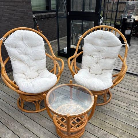 2 hvide bambuslænestole sælges. Stolene er i god og solid kvalitet.
