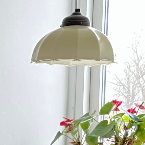 Pendel i opal glas med messing ophæng. Guldbelade blomstermotiv på glasset.