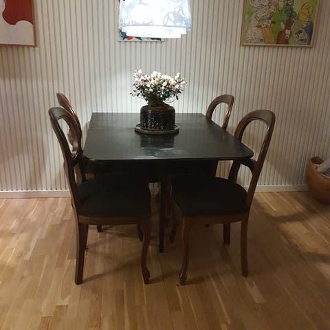 Kompletsæt med 8 stole, betræk på stole er slidt. forlænger bordplader forefindes.