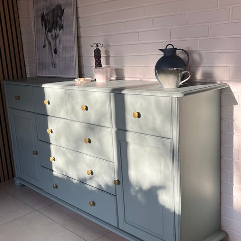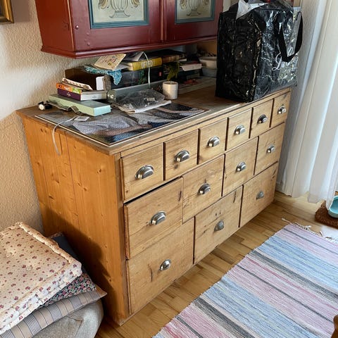 Købmandsdesk med skuffer og hylder. Har fået hvid lud