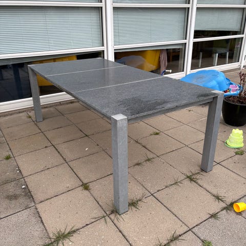 Bordet er egnet til udendørs brug på terrasse eller altan og har plads til flere stole langs siderne. Designet er enkelt med lige ben og en lang bordplade opdelt i flere plader.