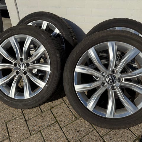 17" originale VAG (Montpellier) med 215/50R17 sommerdæk fra 34/22. 5-6 mm mønster. Fælge er ET40. Ingen mærker, andet end et på nogle millimeter, se foto. Kan afhentes ved Bogense.