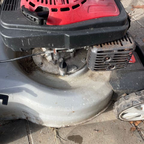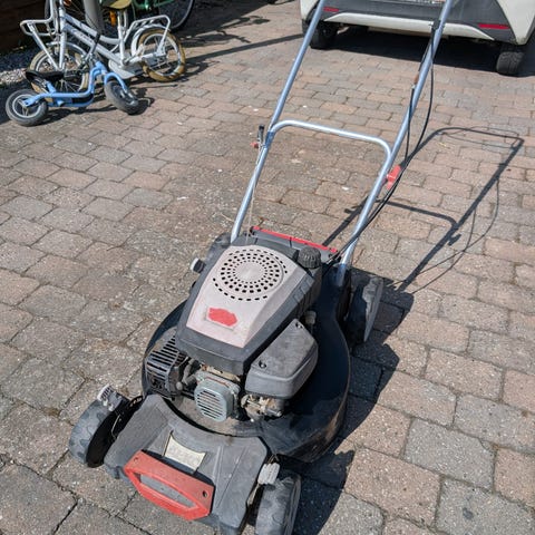 Benzindrevet plæneklipper i rød og grå med græsopsamler bagpå.