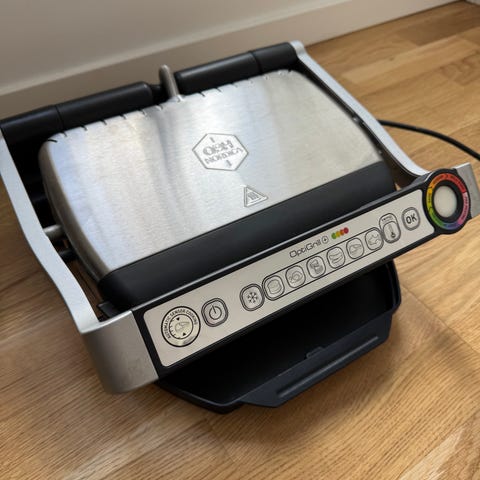 OBH Nordica Optigrill bordgrill med non-stick grillplader og integreret drypbakke. Grillen har flere forudindstillede programmer til forskellige typer mad samt indikatorlys på frontpanelet. Velegnet til tilberedning af kød, grøntsager, panini og andre grillretter i køkkenet. Grillpladerne er rillet for at lede fedt væk fra maden og give grillmønster.