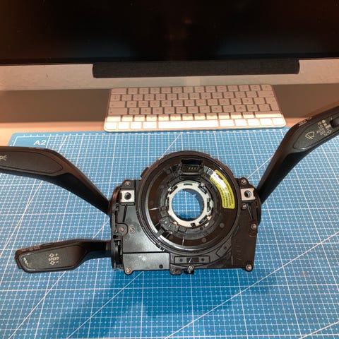 Fartpilot arm med integreret kontaktmodul, reservedel med delenummer 96837159XT / 12272005. Enheden har elektrisk stik med flere ben og er beregnet til montering i ratstammen på en bil, hvor den bruges til betjening af fartpilot. Velegnet som erstatningsdel, hvor samme delenummer anvendes.