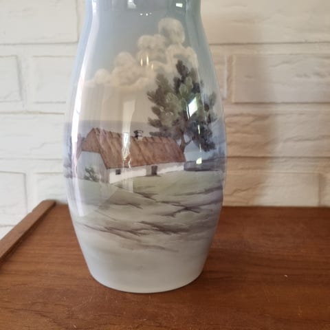Den kongelige porcelænfabrik: vase i porcelæn med dekoreret landskabsmotiv med bindingsværkshus. Vasen har rund, kugleformet krop og smal åbning øverst, velegnet til mindre buketter eller enkeltstående blomster. Undersiden er mærket med Bing & Grøndahl/Royal Copenhagen stempel og formnummer. Farverne er overvejende blå, grå og hvide nuancer i glasuren.