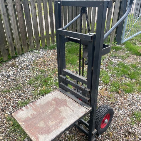 Spangkilde Teknik sækkevogn med løftefunktion. Robust sækkevogn i metal med håndsving og kædetræk til løft af tunge emner. Udstyret med stor, fast lasteplade og to luftgummihjul med røde fælge, egnet til transport og håndtering af gods på ujævnt underlag. Velegnet til lager, værksted eller anden materialehåndtering, hvor der er behov for både kørsel og løft af emner.
