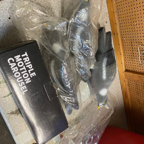 Klassisk lerduekaster, med fjerder, der holder. Sælges alene for 750 kr. Lerduerne (325 stk - 20 i hver stak plus det løse) sælges særskilt for 325 kr. Men du får det hele samlet for 1.000 kr.