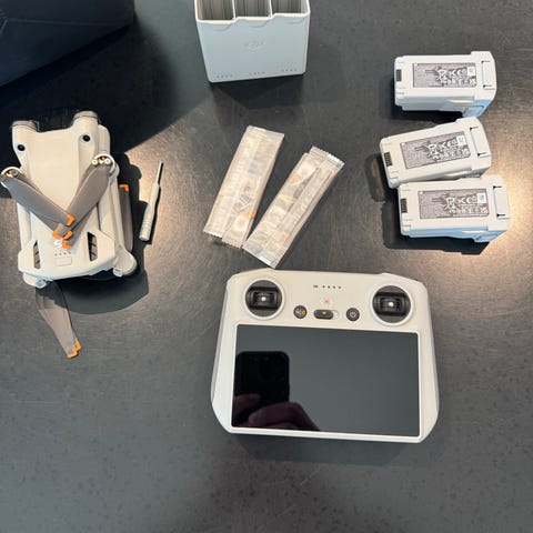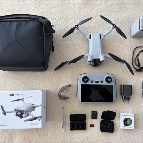 DJI Mini 3 Series drone med RC-fjernbetjening og 360° propellerbeskytter. Dronen vejer under 249 g ifølge emballagen og leveres med fjernbetjening med indbygget skærm. Propellerbeskytteren er designet til DJI Mini 3-serien og giver 360 graders beskyttelse af propellerne under flyvning. Velegnet til brugere, der ønsker en kompakt drone med ekstra beskyttelse omkring propellerne.