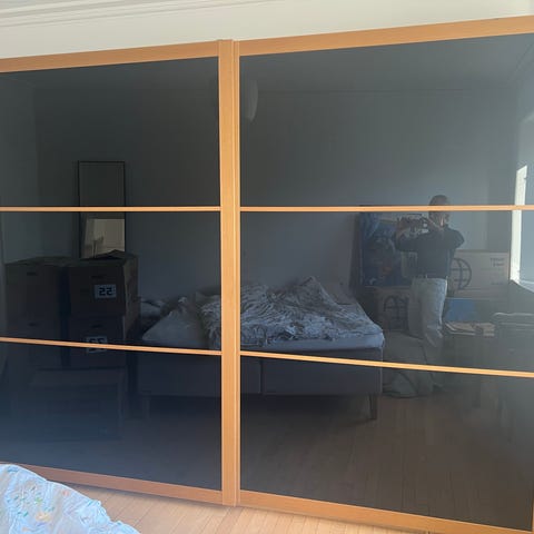 Fint garderobe fra IKEA med skydelåger i egetræsmønster som måler : h 235 x l 200 x b 66 med alt tilhørende, hylder, skuffer med glasfront, netkurve og bøjlestang. 5 år gammelt og ingen brugsspor nypris 7.000kr sælges