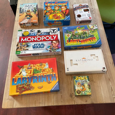 Samling af forskellige familiespil og kortspil. Blandt spillene ses blandt andet brætspillet 4 på stribe, kortspillet Sorteper, vendespil, spillet Global Cooling, Category X samt flere mindre spil. Spillene er egnede til familiebrug og kan spilles af flere deltagere ad gangen afhængigt af det enkelte spil. Velegnet til hyggestunder, leg og underholdning for børn og voksne i blandede aldersgrupper.