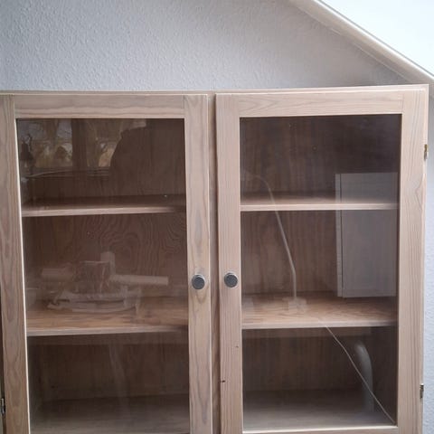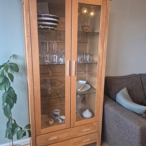 Skal sælges hurtigt - bud er velkommen. Vitrine skab i halvrundt design i træ med glaslåge. Skabet har udskårne og intarsiadetaljer på sider og top. Foran er der en enkelt glaslåge ligeledes med intarsia med profileret ramme, som giver indkig til hylderne indeni, velegnet til opbevaring og udstilling af glas, porcelæn eller pyntegenstande. Øverst er der en skuffe til mindre genstande. Skabet står på slanke ben og er egnet til placering op ad væg i stue, spisestue eller entré.