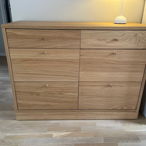 Vi sælger denne lækre kommode i egetræsfiner fra IKEA serien TONSTAD med 6 skuffer. Den er kun brugt i omkring en måned, så ingen synlige brugsspor, men sælges grund ønske om nyt møbel.