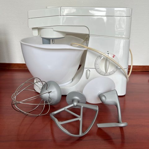 Tilbehøret omfatter blandt andet stor metalskål med plastlåg, piskeris, dejkrog og K-spade/rørepisker.