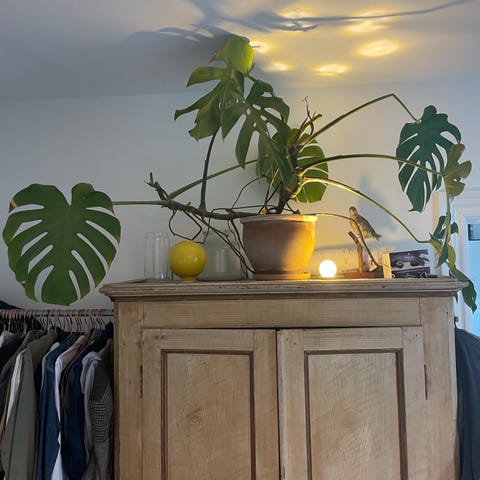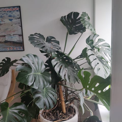 Large monstera deliciosa plant in a good condition. Healthy plant with beautiful leaves but could use better support and a larger pot. Height about 120cm, width about 90cm, pot size ø22cm. Plastic pot and support pole included.