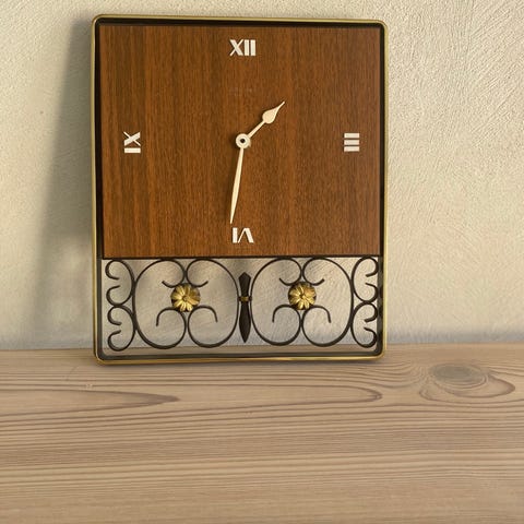 Mekanisk vægur i træ med pendul. Uret har et klassisk design med udskæringer og dekorationer på fronten. Skiven er rund med tydelige tal og visere. Kabinettet er i mørkebrunt træ med glasrude foran - obs glasset er knækket og skal repareres.