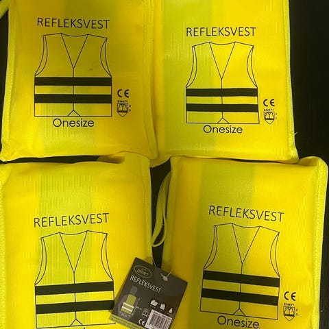 Falck førstehjælpssæt med refleksvest i orange. Sættet indeholder en blå førstehjælpstaske med forskelligt førstehjælpsudstyr som forbindinger, plastre, saks og tilbehør til mindre skader. Der medfølger 3 orange refleksvest med brede refleksstriber, egnet til brug ved nødsituationer i trafikken eller andre situationer, hvor synlighed er vigtig.
