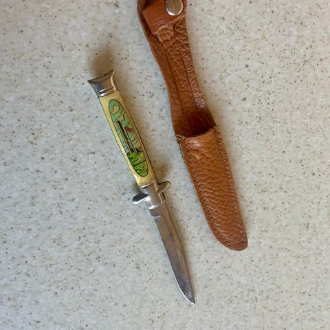 Ubranded hakkekniv med dobbelt håndtag og tilhørende blå trækasse. Kniven har buet klinge i metal og to lyse håndtag i træ eller plast. Trækassen 45x31 cm er rektangulær med høje sider, velegnet som opbevaring eller som underlag ved brug af kniven. Er nok mest til dekoration, kassen skal repareres