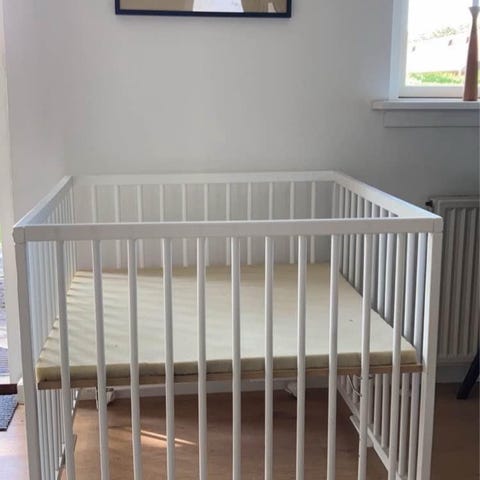 Fin kravlegård i 85x85 med madras. Kan indstilles i 2 højder