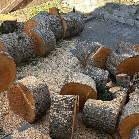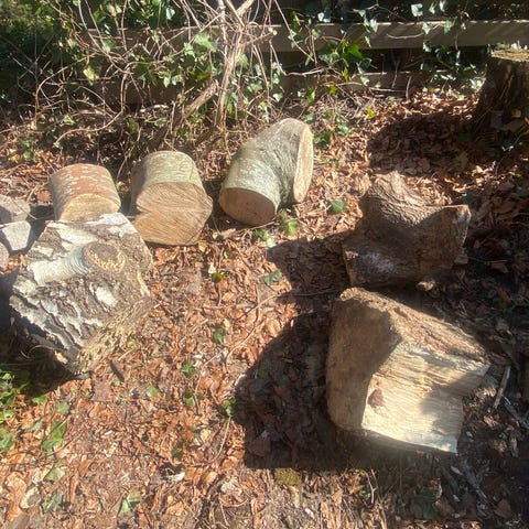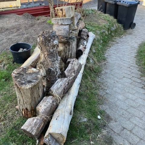 Brændestykker skåret af træstammer i forskellige størrelser. Egnet til brug som brænde, til bålplads eller andre have- og udendørsprojekter. Stykkerne fremstår som hele og halve stammer, der kan tilpasses efter behov ved yderligere opsavning eller kløvning.