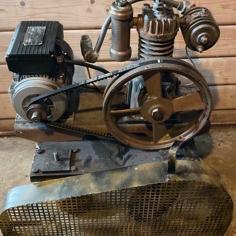 Kgk 7,5 hk 300 liters tank. Kørte da jeg købte den, sælges derfor som beset. Def er 2 hakker i den lille remskive. Sælges da jeg ikke har nok strøm til den.