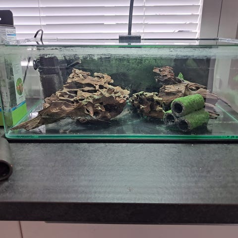 Akvarie med tilbehør, pumpe, 3 stk dragonsten, trærødder, LED lys, underlag mm medføgler.