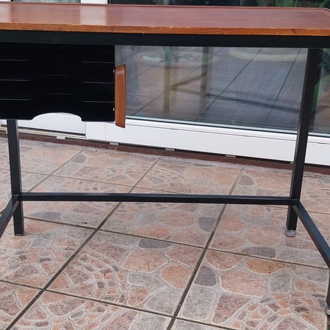 Vintage skrivebird i teak med sortlakeret metal understel. Dk 1960-70's. Hxbxd: 67x8yx43 cm. Frihøjde 63 cm. Fribredde 45 cm.