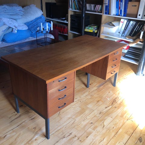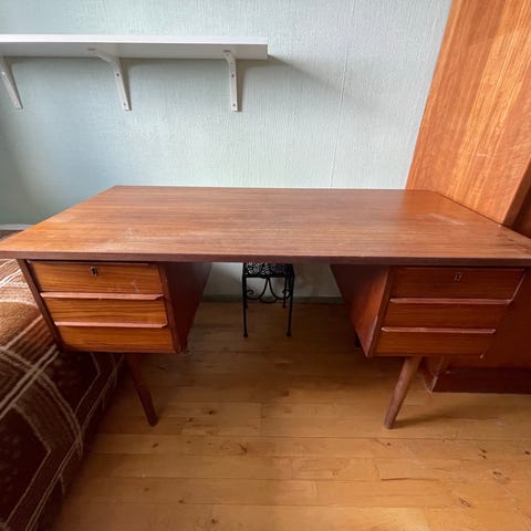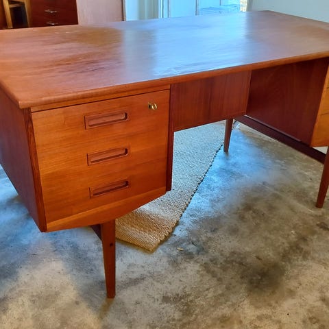 Velholdt teak skrivebord sælges. Der medfølger nøgle til at åbne og låse skuffer og skabe.