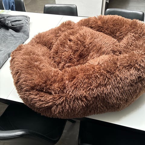 Rund hundeseng i grå plys. Sengen har en blød, polstret kant hele vejen rundt og en fyldig bund, som giver et blødt leje. Diameteren er cirka 80 cm, målt udvendigt. Egnet til mindre hunde eller andre små kæledyr, der foretrækker en omsluttende liggestilling. Ydersiden og indersiden er beklædt med samme bløde plys-materiale.