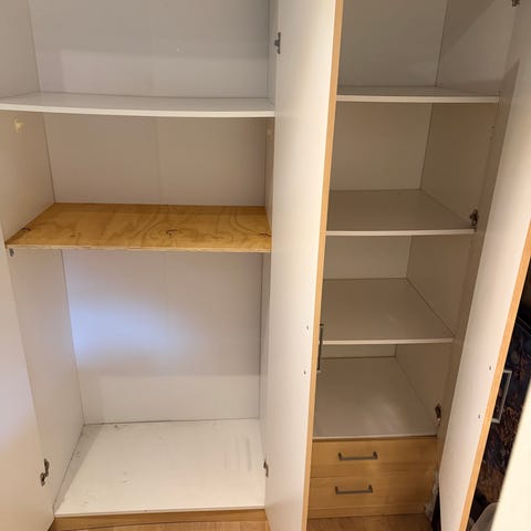 Garderobe skab med hylder og trådkurve.