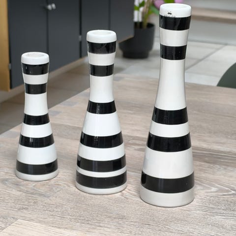Kähler Omaggio lysestager i keramik med stribemønster i forskellige farver. Lysestagerne har en slank, buet form og er velegnede til almindelige kronelys. De kan bruges enkeltvis eller samlet som et sæt på bord, reol eller vindueskarm som en del af boligindretningen.