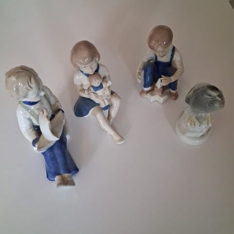 Porcelænsfigurer bestående af to figurer: en siddende pige med bold og en stående pige sammen med en ged. Begge figurer er udført i lyse farver med blå og beige nuancer og har en glaseret overflade.