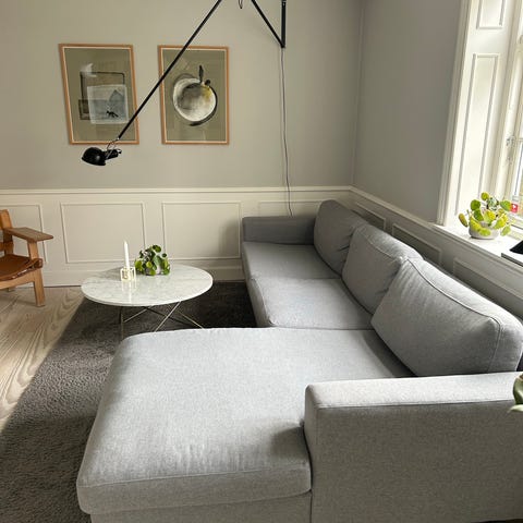 Smukkeste lys grå chaiselong sofa i blødt og slidstærkt kvalitets stof. Betræk på puder og hynder kan aftages og vaskes i maskine.