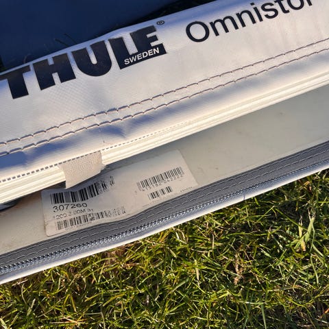 Thule Omnistor markise til campingvogn. Posemarkise med en udtrækslængde på ca. 350 cm. Dugen er i grå nuancer med bølgemønster. Velegnet til montering på campingvogn eller autocamper.