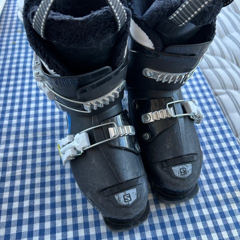 Salomon junior skistøvler i størrelse 24.0. Modellen x3-60T er i sort med justerbare spænder på fronten, som giver mulighed for at tilpasse pasformen. Støvlerne har hårdt yderskal og polstret indersko for støtte og komfort ved alpint skiløb.