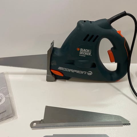 Black+Decker stiksave med 18V lithium-ion batteri og tilhørende lader. Saven er ledningsfri og egner sig til forskellige typer skæreopgaver i træ og lignende materialer. Medfølgende batteri er 18V 2,0Ah lithium-ion, og laderen er tilpasset samme batteritype. Ergonomisk håndtag med gummibelægning for bedre greb. Leveres med brugervejledning som vist på billederne.