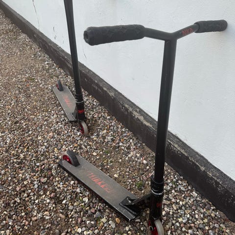 Trick løbehjul i sort og guld. Egnet til brug som trick- eller stuntløbehjul for børn eller unge, afhængigt af højde og behov.