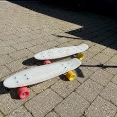 Skateboard med farverig grafik på undersiden og sort griptape på oversiden. Boardet har klassisk dobbelt-kick form og er udstyret med hvide hjul. Velegnet til almindelig skatebrug på gade og ramper.