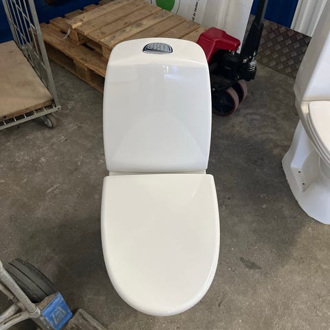 Toilet i hvidt porcelæn med cisterne og toiletsæde. Gulvstående model med skjult cisterne bag ryggen. Egnet til montering i badeværelse eller gæstetoilet. Standard højde og dybde, til almindelig brug i bolig eller lignende miljøer.